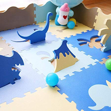 Baby Matten met hek dinosaurus stijl met 18 dik (0.56") schuim tegels kinderen kamer Decor grote Vloermatten in elkaar grijpende patronen. Maat 35.4 X 75.9 CM