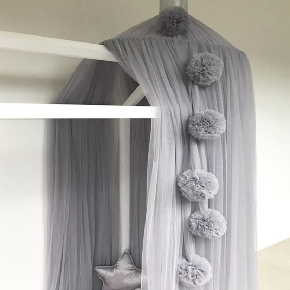 Hele mooie chiffon pom pommen. In het roze, grijs en wit te verkrijgen. Mooi aan een klamboe, maar ook mooi aan een kledingrek, deurklink, haakje aan de muur of aan een bed.