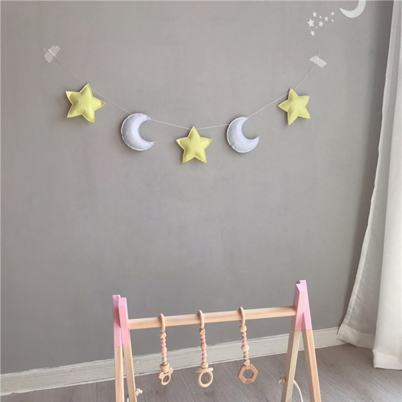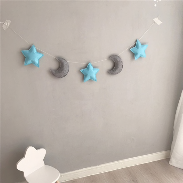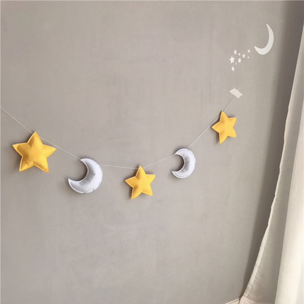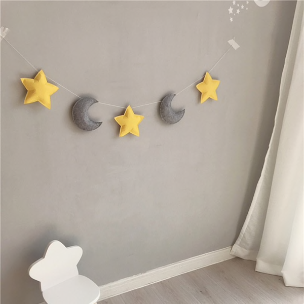 Beschrijving: Product Naam: Sterren Maan Decoratie Materiaal: Vilt + katoenen draad Totale lengte:1.5 meters, (ster) 17 cm Kleur: Als de foto Toepassingsgebied: decoratieve hangers voor baby kamers Pakket Inhoud: 5 sterren en maan snaren voor elke kleur Netto gewicht: 0.07 kg Verpakking Maat: 22*20*9 cm Pakket omvat:1 * hanger
